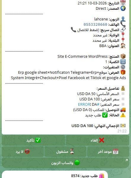 إشعارات المبيعات: تصلك رسالة فورية على تيليجرام عند تسجيل كل طلبية جديدة.