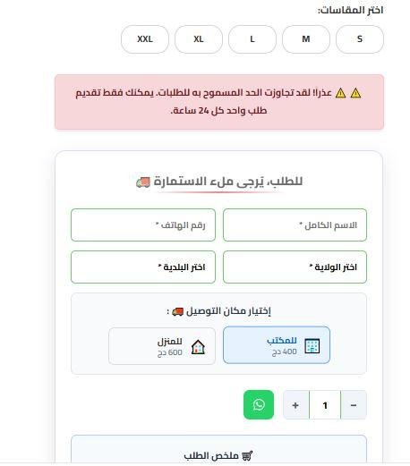 💡 ميزة التحكم في النص: يمكنك تغيير رسالة التنبيه في أي وقت لتناسب لهجتك أو نوع عرضك! (مثال: “⚠️ عذراً! لقد تجاوزت الحد المسموح به للطلبات. يمكنك فقط تقديم طلب واحد كل 24 ساعة.”)