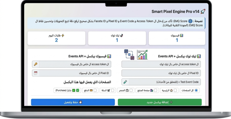 لا تترك سنتيماً واحداً يضيع في الهواء! 💸! مع القدرة على اضافة عدد غير محدود من البيكسل و (API) نظام تتبع البيكسل الاحترافي (Smart Pixel Tracking) لـ TikTok و Facebook.